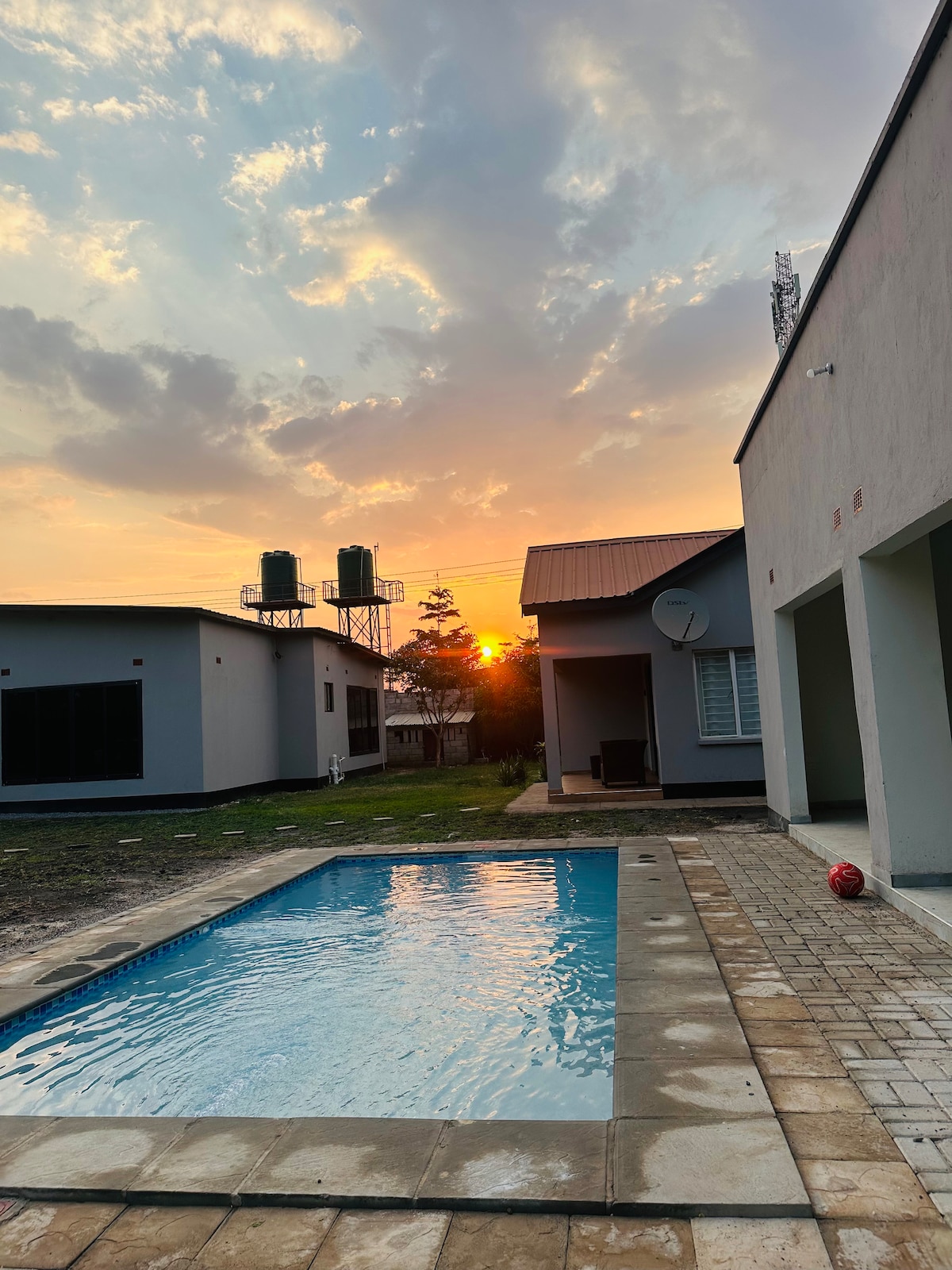 Ngôi nhà trung tâm, nhưng yên tĩnh, thanh bình, rộng rãi với những khu vườn trưởng thành, tươi tốt. Tận hưởng hồ bơi riêng tuyệt đẹp, thư giãn trong vọng lâu, lắng nghe tiếng chim hót và ngắm sao vào ban đêm bên hố lửa vào buổi tối mát mẻ. Ngôi nhà đi kèm với nhân viên ban ngày có thể giúp nấu ăn, giặt giũ và đảm bảo bạn có thời gian lưu trú thoải mái, năng lượng mặt trời 24/7 cho tất cả các tiện nghi thiết yếu, wifi starlink, hệ thống an ninh cao cấp và lỗ khoan riêng. Có thể đến từ Twin Palm hoặc Great East Road. Gần sân bay.