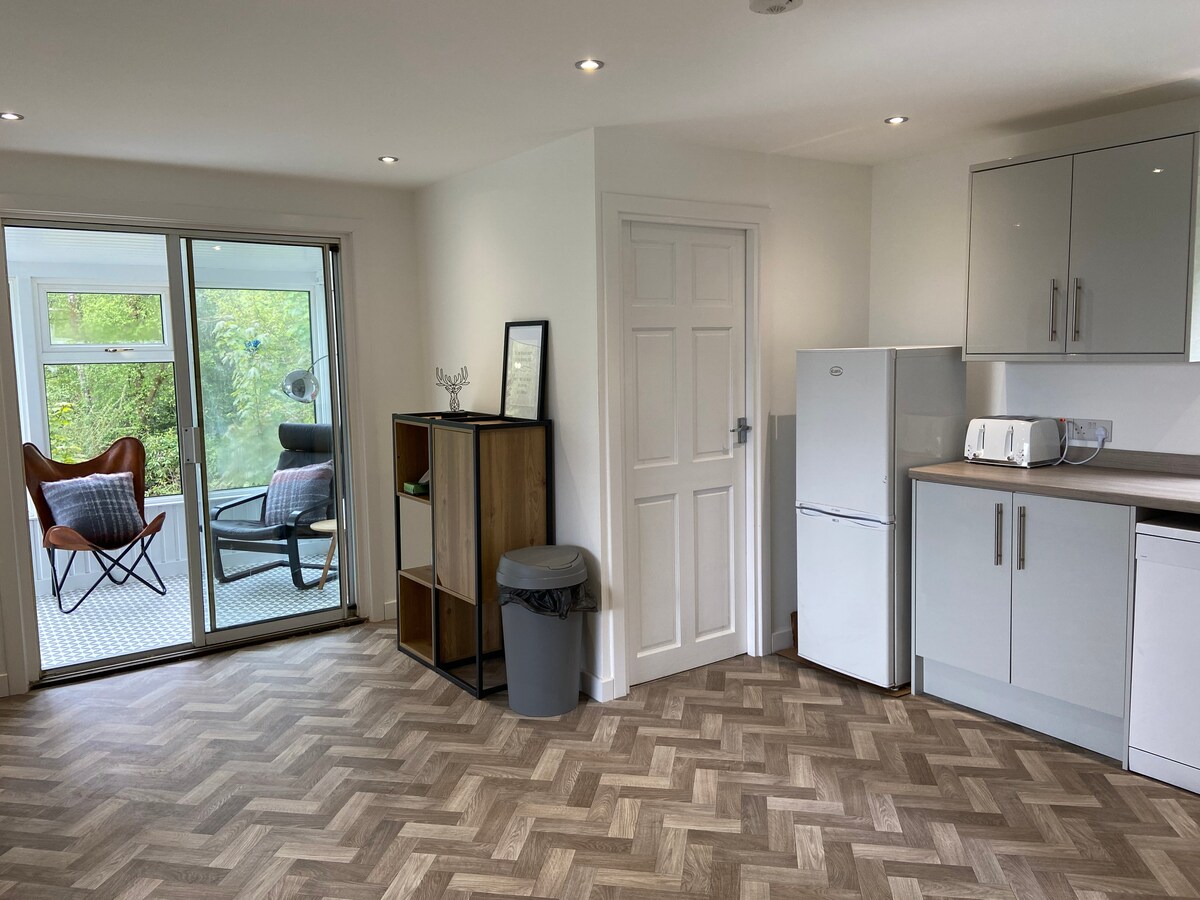 Located rurally, though not isolated, just 11 miles from Oban. The perfect cosy, highland hideaway to relax, recharge & reconnect. Stunning mountain views from upper garden. Perfect for a couple or family due to open-plan design. Fully equipped kitchen, superfast broadband & room darkening blinds in both sleep areas. No cleaning fee added on. Car essential. Free parking to door. Max of 4 persons. No extra persons please. Double bedroom + 2nd king size sleep space on open-plan mezzanine area.