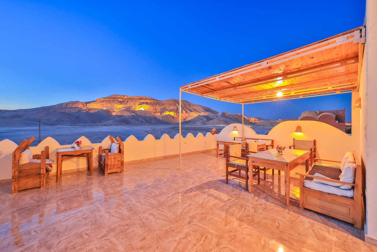 Beit El Hana nằm gần tất cả các địa danh quan trọng như Thung lũng các Nữ hoàng, Thung lũng các Vua và Đền Medinet Habu.Beit El Hana mang đến khung cảnh bình minh và hoàng hôn tuyệt đẹp, và bạn cũng có thể tận hưởng những chuyến bay khinh khí cầu vào buổi sáng.Chúng tôi cũng cung cấp sân thượng và vị trí quan sát lý tưởng để xem nhật thực toàn phần năm 2027.Sân thượng ở đây sẽ là nơi lý tưởng để xem nhật thực, và có một khu vực ở đây mang đến tầm nhìn ngoạn mục ra Thung lũng Queen.