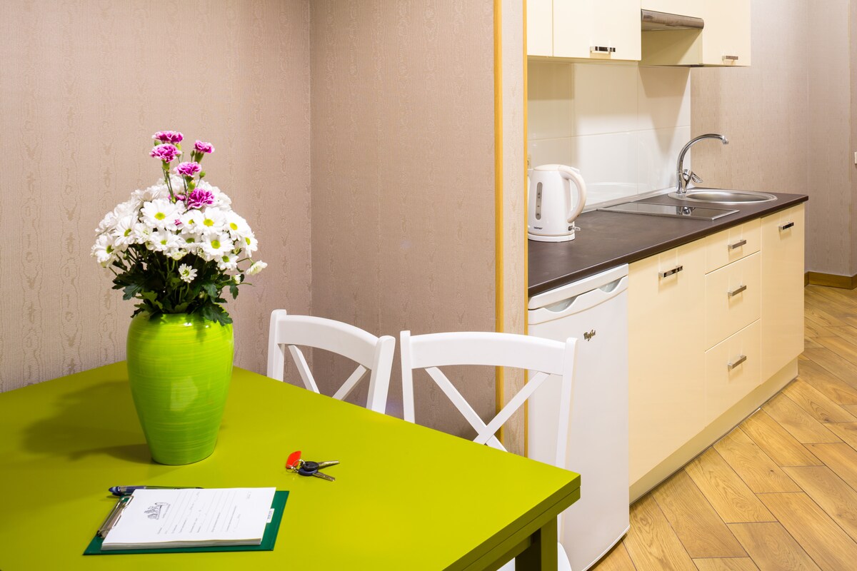 Chúng tôi cung cấp cho bạn các căn hộ sang trọng để có thời gian lưu trú thoải mái nhất ở Lviv. Căn hộ sẽ khiến bạn quan tâm với vị trí thuận lợi – 270 mét từ đường phố lịch sử đến Đại lộ Liberty, nội thất tân cổ điển thú vị, tầm nhìn tuyệt đẹp từ cửa sổ của Cung điện Bá tước Potocki, khả năng đỗ xe của riêng bạn trong sân. Bạn sẽ không cảm thấy thiếu không gian hoặc ánh sáng. Ngoài ra, bạn chỉ cần lên tầng 2 ở lối vào tốt. Và, tất nhiên, sự sạch sẽ trơn tru.