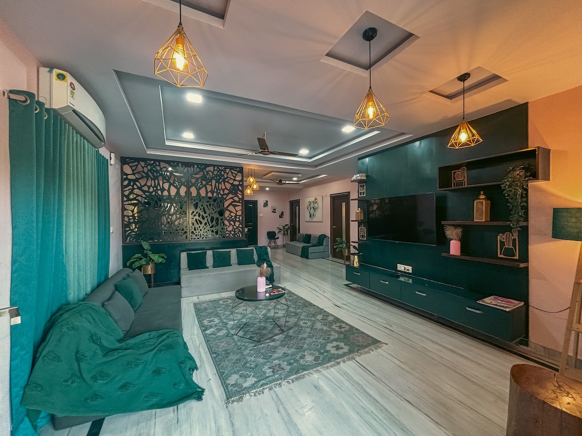 Luxurious, homely, secluded and only 5 mins from Hi-Tech City, this Full-Floor Apartment on the 2nd Floor is perfect for: - Family of 2-15 ppl, Wedding guests, NRI's etc, who need a centrally located home & daily maid service. - Remote working employees who need high-speed Wifi, a fully stocked kitchen & Inverter power back-up. - Couples who want a short term staycation & Chill in front of a 50" 4K-smartTV - Friends who need a private place to hangout in the city SELF-CHECK-IN using Smart Lock