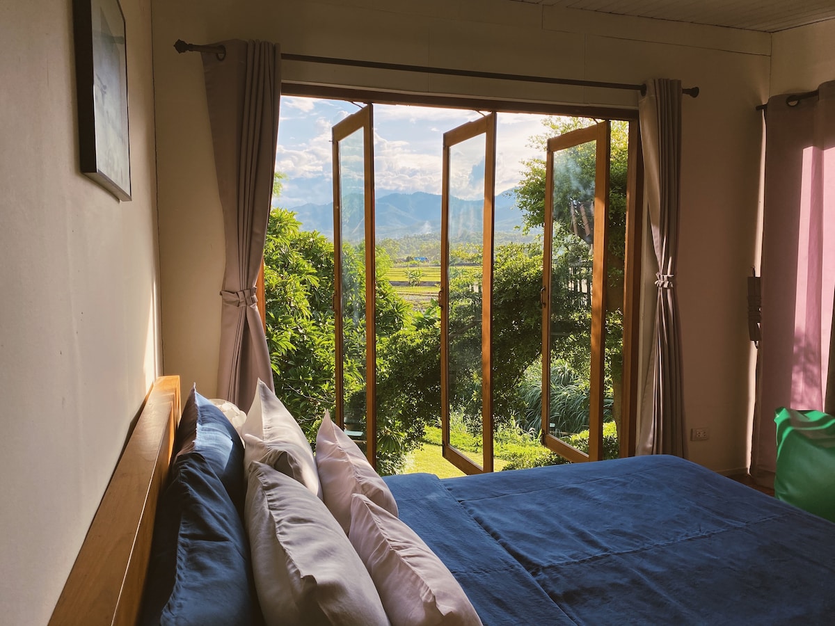 You are traveling north. The highway is solid, the mountains rich with forest. Checking your map, you realize just how many caves, temples and cafés are in the area. You make a mental note: "Go explore." First you check into your AirBnB. You find yourself surrounded by orchards, ever closer to the mountain. Directly at the foot of Chiang Dao mountain stands your house. Wooden with fiber internet. 5min ride to the hot springs, and 8min to town. Welcome to the "Yellow Door Cottage".