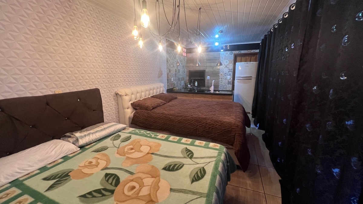 Acomodação prática para até 4 pessoas, 1 cama de casal, 2 camas de solteiro, a minutos dos melhores pontos da cidade, podendo ir a pé, bares, restaurantes, postos, farmácias, mercados, 1,5km do hospital, garagem para 2 carros.