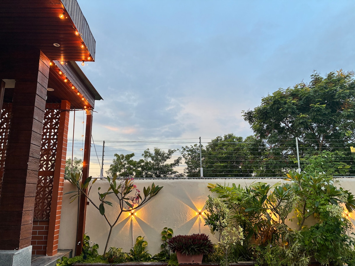Đưa cả gia đình đến nơi nghỉ dưỡng ấm áp và thân thiện này! Tận hưởng thời gian lưu trú rộng rãi với 2 phòng ngủ thoải mái, phòng khách ấm cúng, bếp đầy đủ tiện nghi và 2 phòng tắm sạch sẽ, hiện đại. Cho dù bạn đang thư giãn trong nhà hay khám phá môi trường xung quanh, ngôi nhà này hoàn hảo cho gia đình vui vẻ, thoải mái và kết nối. Vị trí lý tưởng nếu bạn đến từ ngoài thành phố để tham quan Thành phố phim Ramoji, Charminar, Shanti Vanam, Srisailam, v.v. 35 phút lái xe từ khu tài chính và kết nối tuyệt vời.