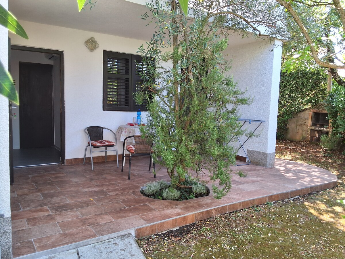 Apartman je u prizemlju kuće, okružen zelenilom i ima hladovitu terasu. Do plaže 150 m, do centra i trgovina oko 300m. Parking u dvorištu. Apartman ima dvije sobe, veću sa bračnim krevetom i manju sa dva odvojena kreveta. Kuhinja je opremljena - hladnjak, frizer, mikrovalna pečnica, kuhalo za vodu, plinski štednjak, suđe i pribor za jelo. Kupaonica sa tušem i WC. Klima uređaj. Kućni ljubimci su dobrodošli. Boravišna pristojba po osobi 1,5€/dan.