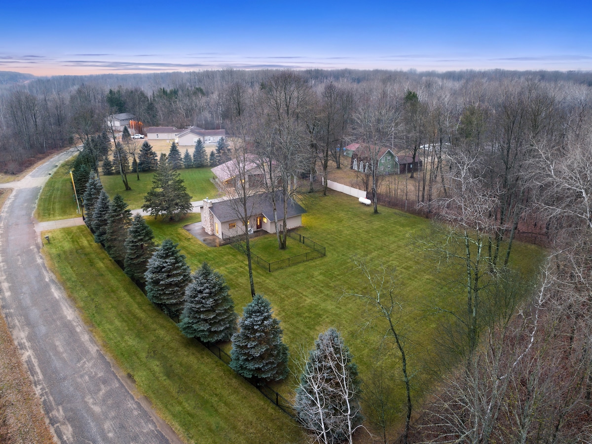 Spacious and comfortable home on 5 acres with forest trail, walking dist to Blue Lake, ORV trails and sits next to state land! 2200+ sq ft- Plenty of open space to entertain, fire pit, pool table, wood burner, 65" smart TV w/BLU Ray/DVD, high speed internet & wifi. 14x14 Jacuzzi room *add $39/night (must request and pay in advance) . Perfect for hunting, fishing, snowmobiling, quads, fall colors, or just R&R. <1 hour away from Traverse City and surrounding attractions! 21+to rent note no A/C