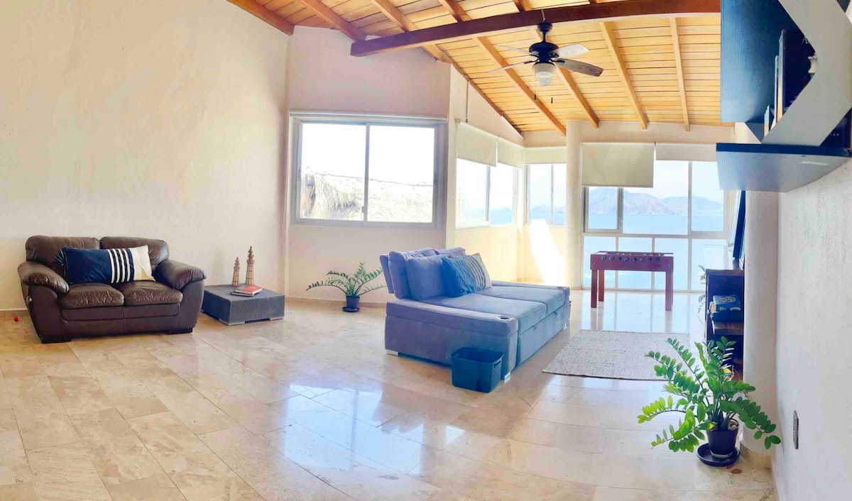 Ngôi nhà tuyệt vời với tầm nhìn ngoạn mục nằm trên bán đảo Las Hadas là điểm hoàn hảo cho kỳ nghỉ gia đình hoặc nhóm của bạn. Sân hiên ngoài trời 2 tầng lớn với bể ngâm nước nóng và được xây dựng trong vỉ nướng . Tầm nhìn ra đại dương qua nhà . 10 phút đi bộ đến Bãi biển (Playa la Audiencia). Dễ dàng đến khu mua sắm Walmart, Sams Club, Starbucks và các nhà hàng khác. An ninh có cổng 24 giờ. Phương tiện giao thông công cộng (xe buýt) chạy trước lối vào căn hộ. Thân thiện với thú cưng, chúng tôi chấp nhận chó và mèo nhỏ.
