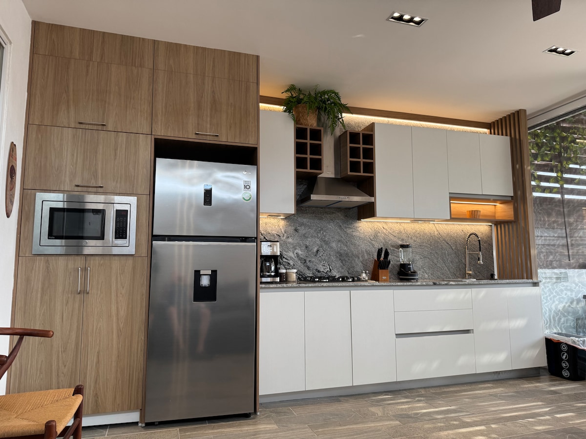 Chào mừng bạn đến với Villa Gadi, một biệt thự riêng mới và thanh lịch ở Manzanillo, thân thiện với thú cưng, nơi bạn được bao quanh bởi thiết kế sang trọng, yên tĩnh và hiện đại. Thư giãn trong bể tắm nhỏ có hệ thống sưởi (kích thước 8 ft 2 in × 4 ft 3 in × sâu 2 ft, không có vòi phun), ngắm hoàng hôn từ khu vườn trên mái nhà và chuẩn bị bữa tối trong lò nướng dùng củi hoặc bếp nướng BBQ. Thư giãn trên võng với làn gió nhiệt đới. Điều hòa nhiệt độ trong toàn bộ biệt thự, bao gồm 3 phòng ngủ với giường và TV thoải mái. Bãi biển chỉ cách đó 10–15 phút lái xe.