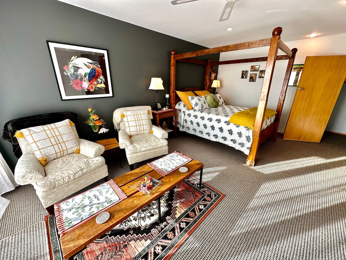 Studio có bếp nhỏ và phòng tắm khép kín nhỏ gọn hiện đại. Nó được trang bị đầy đủ nội thất và mọi thứ cần thiết cho thời gian lưu trú của bạn, bao gồm Wi-Fi miễn phí và bãi đỗ xe ngoài đường. Studio độc lập có lối vào riêng trong sân chung với ngôi nhà chính, nằm trên 2 ha (5 mẫu Anh) ở vùng nông thôn cách trung tâm thành phố Nelson 15-20 phút. Chúng tôi có bò, dê, gà, mèo và chuồng chim nhỏ. Bạn được hoan nghênh khám phá chỗ ở và tận hưởng khung cảnh và đời sống chim chóc.
