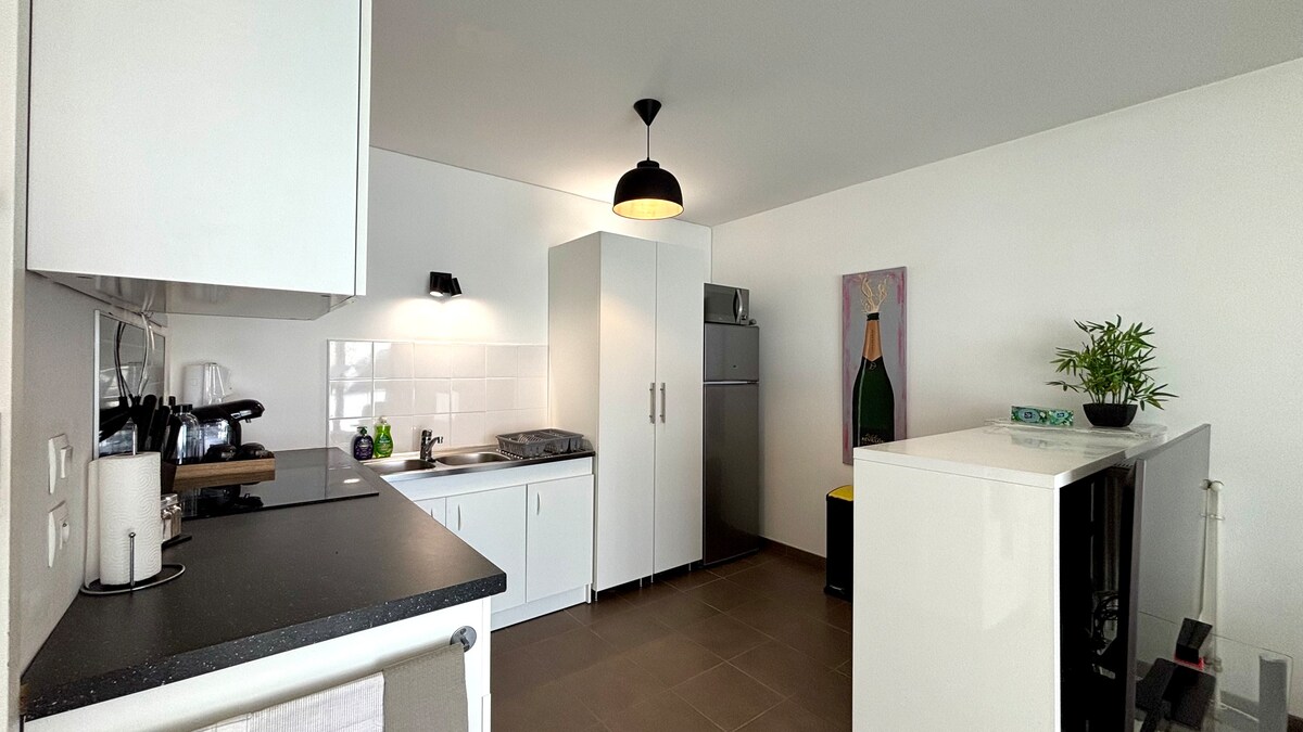 Chào mừng bạn đến với căn hộ đáng yêu của chúng tôi. Nằm trong tòa nhà hoàn toàn mới và được trang trí trang nhã, căn hộ này hoàn hảo cho thời gian lưu trú với bạn bè hoặc một chuyến công tác. Căn hộ có phòng ngủ thoải mái với giường cỡ queen. Nhà bếp đầy đủ tiện nghi với tủ lạnh, bếp và lò vi sóng. Nằm gần phương tiện giao thông công cộng, căn hộ này là một nơi tuyệt vời để khám phá thành phố. Chúng tôi hy vọng bạn tận hưởng thời gian lưu trú của mình với chúng tôi!