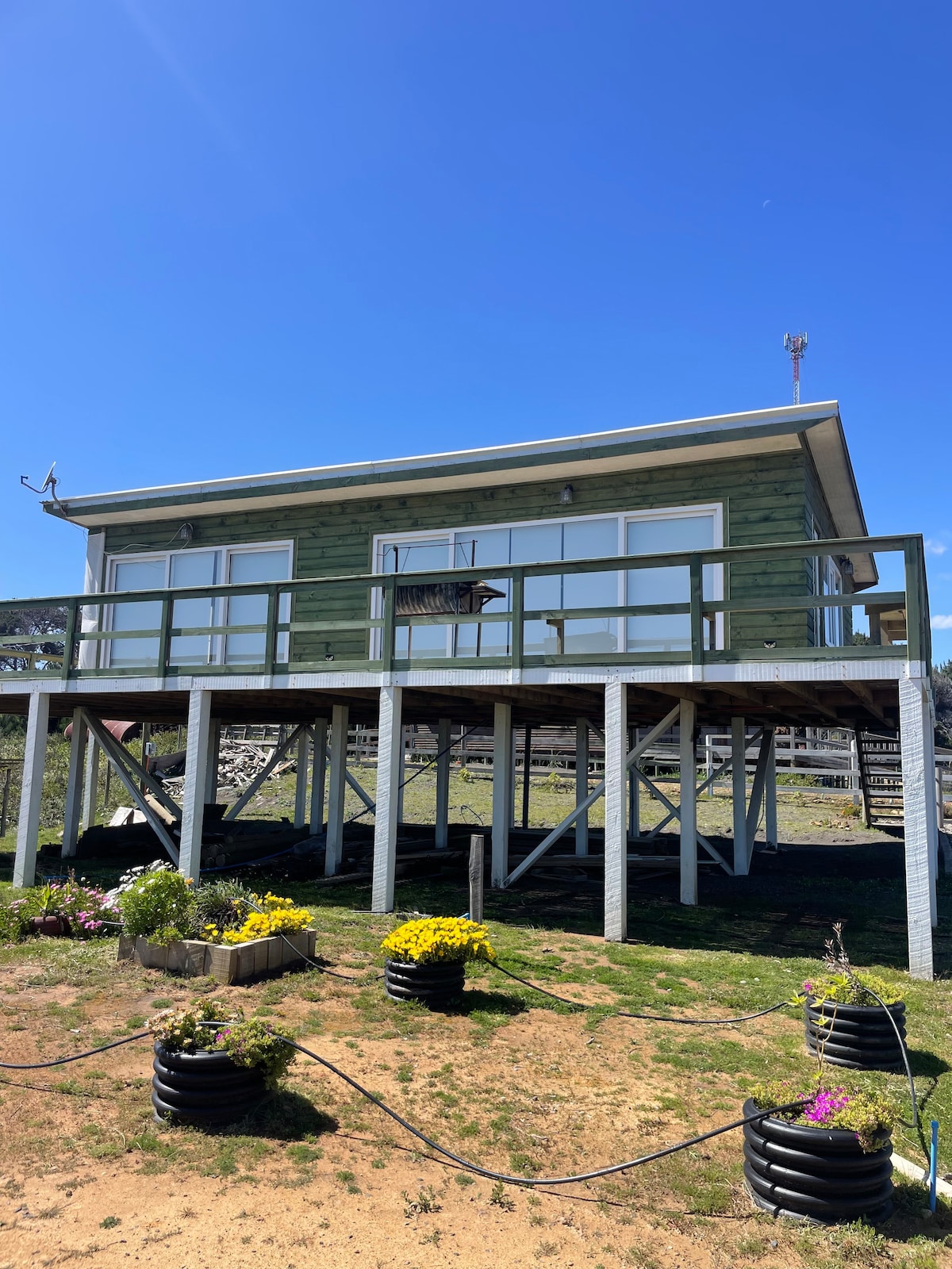Construida encima de cuarzo, a 120m del mar y a 400m del rio Chovellen. WIFI STARLINK (Incluida ene-feb-mar) Casa de madera aprox 115 m2 en dos pisos y terraza, muy cómoda, caben 6 personas en 5 camas (2 de matrimonio, 2 camas individuales. (futón en living) ideal para familias que quieren ir a disfrutar de la naturaleza, kitesurf, surf, kayak o paseos en bicicleta. Esta playa es una delicia para hacer deportes de agua, como para pasar veladas tranquilas, muy pocas personas en ella...