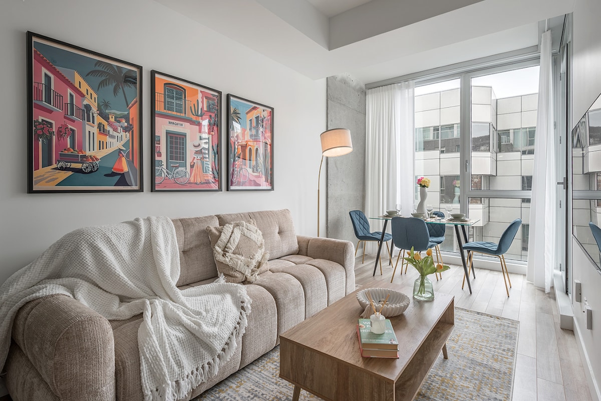 Be in the center of Montreal without feeling overwhelmed. This beautiful 1-bedroom apartment offers a bright living space, a generously sized bedroom, and a fully equipped modern kitchen. Step outside and immerse yourself in the vibrant energy of downtown Montreal. Walk to charming cafés, trendy restaurants, boutique shops, and cultural landmarks. Whether you're visiting for business or leisure, everything is right at your doorstep.