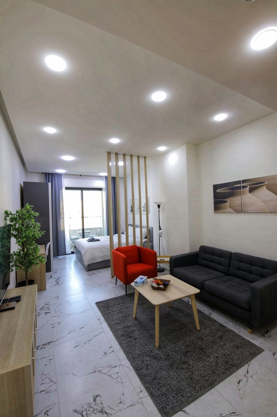 Chào mừng bạn đến với studio ấm cúng và hiện đại này, hoàn hảo cho một kỳ nghỉ thoải mái tại Amman. Nằm thuận tiện gần các trung tâm thương mại, nhà hàng và quán cà phê, bạn sẽ dễ dàng tiếp cận các khu mua sắm và dịch vụ tốt nhất. Được trang bị mọi thứ bạn cần để cảm thấy như đang ở nhà. Studio có bếp nhỏ với tất cả các tiện nghi thiết yếu, điều hòa không khí và TV để bạn giải trí. Phòng tắm có kiểu dáng đẹp và hiện đại, có vòi sen. Bước ra ngoài sân thượng rộng rãi có tầm nhìn tuyệt đẹp ra đường chân trời của Amman với không gian BBQ.