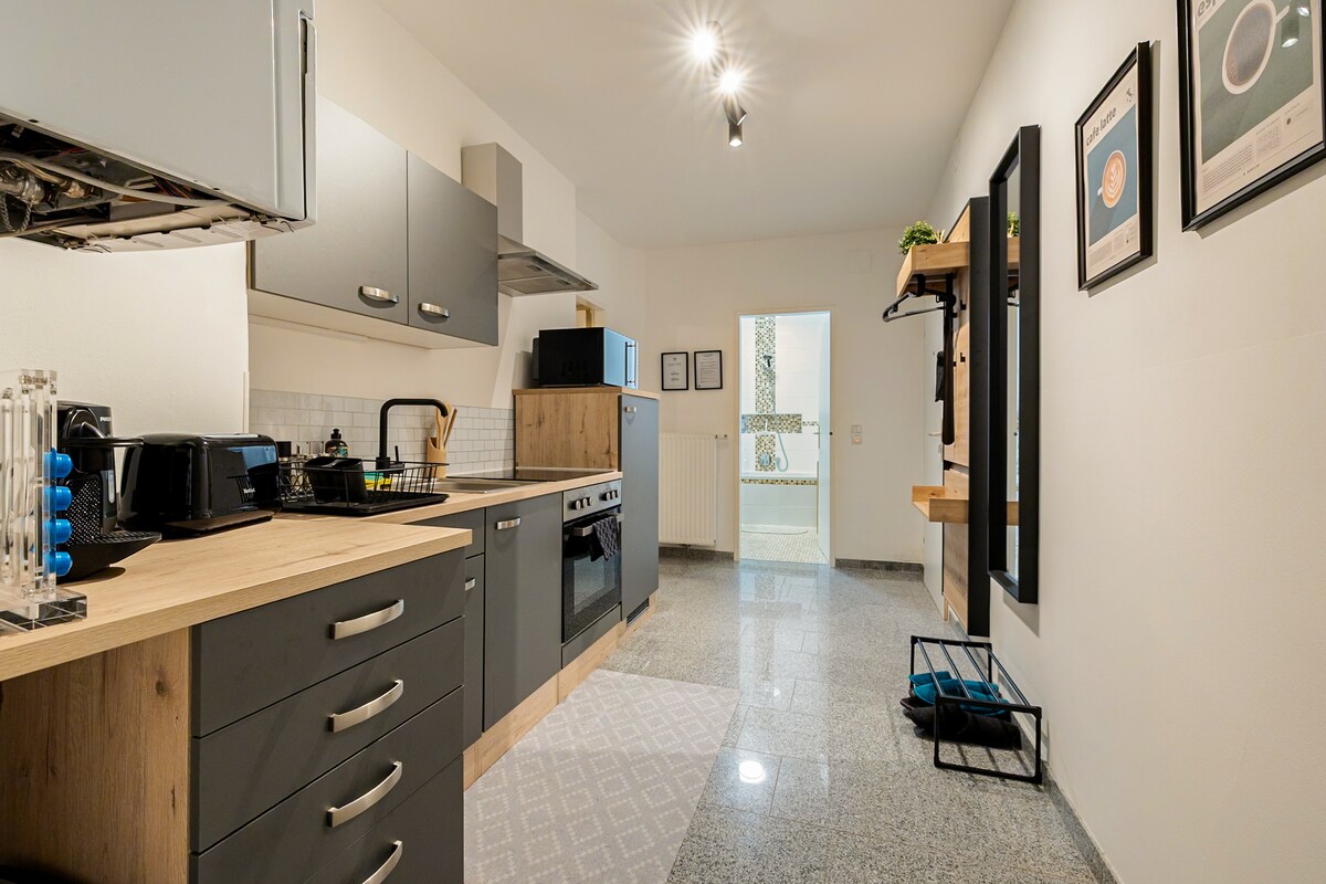 Eleganes Apartment in Wien Meidling mit Schlafzimmer, Wohnküche und Badezimmer mit Dusche und WC. Das Apartment befindet sich ideal gelegen zwischen dem Schloss Schönbrunn (15 Min.) und den Zentrum von Wien (25 Min) und eignet sich als Ausgangspunkt für die Erkundung Wiens oder als Unterkunft für einen geschäftlichen Aufenthalt in Wien. Die U-Bahn Station Meidling ist 10 Min und der Bahnhof Meidling ist 8 Minuten zu Fuß entfernt.