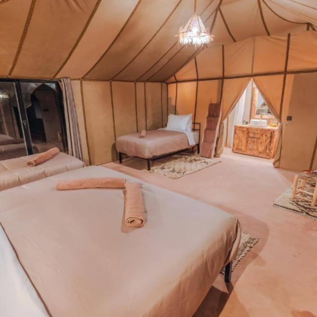 Khu cắm trại Merzouga Horizon sang trọng với các lều sang trọng của chúng tôi mang đến sự thoải mái hiện đại với nét quyến rũ Berber truyền thống, hoàn chỉnh với phòng tắm khép kín và tầm nhìn sa mạc tuyệt đẹp. Tận hưởng những chuyến cưỡi lạc đà, tour 4x4 và những buổi tối kỳ diệu dưới bầu trời đầy sao. Trải nghiệm sự pha trộn hoàn hảo giữa phiêu lưu, văn hóa và thư giãn.