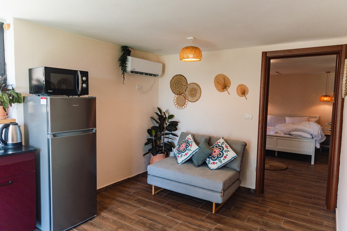 Một căn hộ sa mạc xinh đẹp, mới mẻ và ngọt ngào với lối vào riêng biệt, sân riêng và ấm cúng với pergola, khu vực ngồi ấm cúng và giường thảo mộc. Tzivit là hai phòng ấm cúng và đẹp. Một là phòng ngủ có thạch cao khoáng sản và cửa sổ lớn nhìn ra sân riêng và phòng khách còn lại và nhà bếp cũng có hai cửa sổ và nó mở ra sân. Căn hộ được lót bằng một sàn đá đẹp và được trang trí bằng cửa sổ màu xanh mòng két. Nhà vệ sinh ấm cúng và vòi sen được nuông chiều. Căn hộ nằm gần làng thủ công Tzukim và trong khoảng cách đi bộ đến các lối đi yên tĩnh trên sa mạc. Vị trí của chúng tôi cho phép một kỳ nghỉ độc đáo và yên bình nhưng cũng là lựa chọn để đến Eilat cho một chuyến đi trong ngày