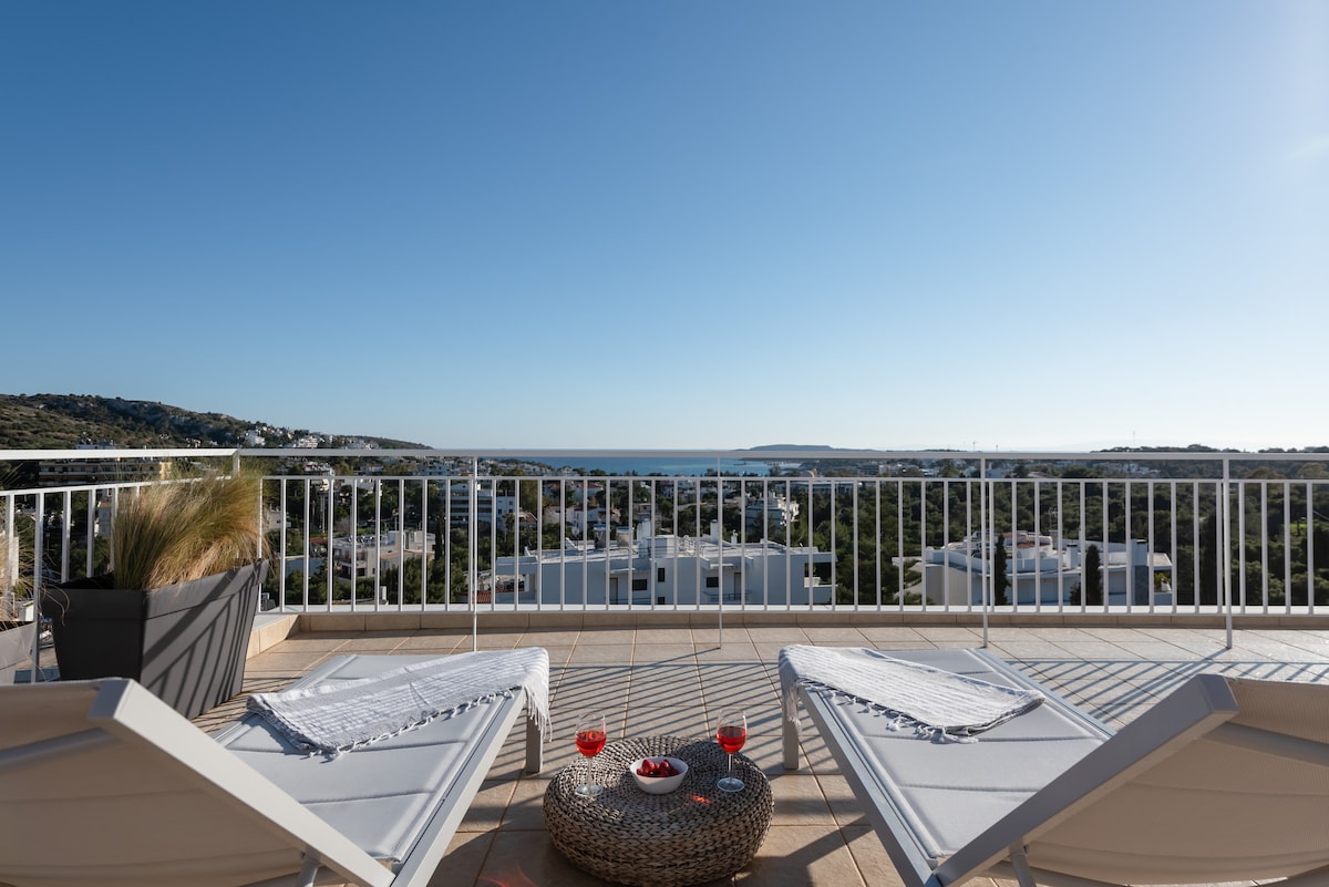 Our newly renovated holiday 45m2 apartment is stylish, minimal yet cozy to make you feel right at home. A haven of white and palest grey, the apartment is filled with natural light throughout the day. Our private 100m2 terrace will give you all the serenity and tranquility you need when on vacation by enjoying the stunning view of Vouliagmeni's Bay. Close to beaches, ski school, tennis court, basketball court, hotels, restaurants, forest, parks, 30' from Athens Centre, 30' from Athens Airport.