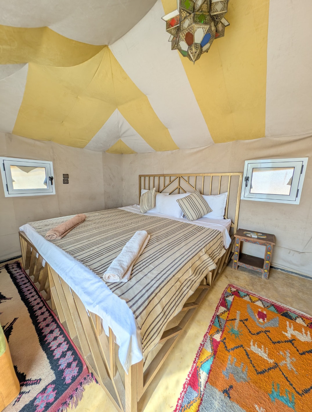 Lều sang trọng của tôi ở Merzouga là một ốc đảo phi thường nằm giữa những cồn cát đầy mê hoặc của sa mạc Sahara. Được bao quanh bởi những cảnh quan ngoạn mục, chỗ ở độc đáo này mang đến tầm nhìn tuyệt vời ra bãi cát vàng trải dài đến tận tầm mắt. Bên trong, lều rộng rãi của tôi được trang trí tinh tế của Ma-rốc và được trang bị tất cả các tiện nghi hiện đại - ga trải giường, phòng tắm riêng với nước nóng và điều hòa không khí cho những đêm sa mạc ấm áp.