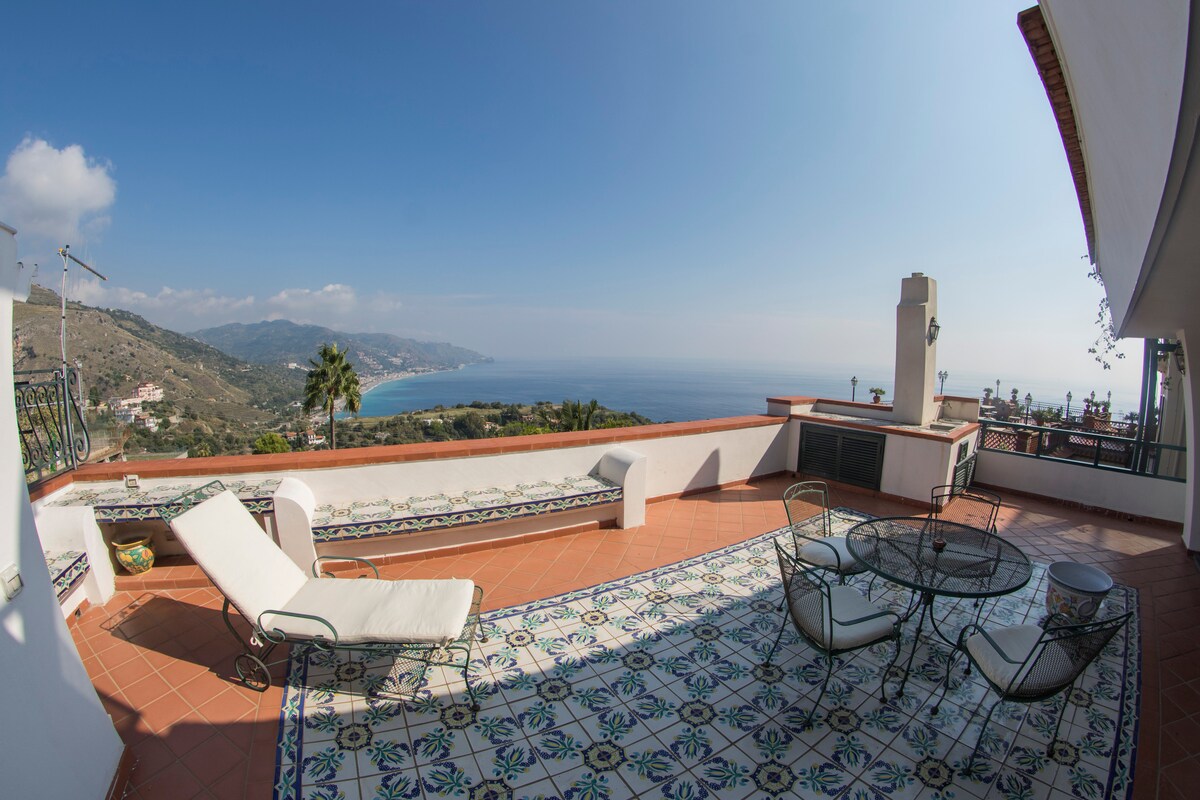Căn hộ có sân thượng lớn và tầm nhìn toàn cảnh Etna và biển, có sẵn trong thời gian ngắn, nằm trong một khu dân cư ngay bên ngoài trung tâm lịch sử, có thể đi bộ trong vòng chưa đầy năm phút. Căn hộ có ba phòng ngủ, hai trong số đó có một giường đôi và một phòng có hai giường đơn, tất cả các phòng đều được trang bị tủ tường; phòng khách rộng rãi với giường sofa, phòng ăn, nhà bếp đầy đủ và hai phòng tắm.
