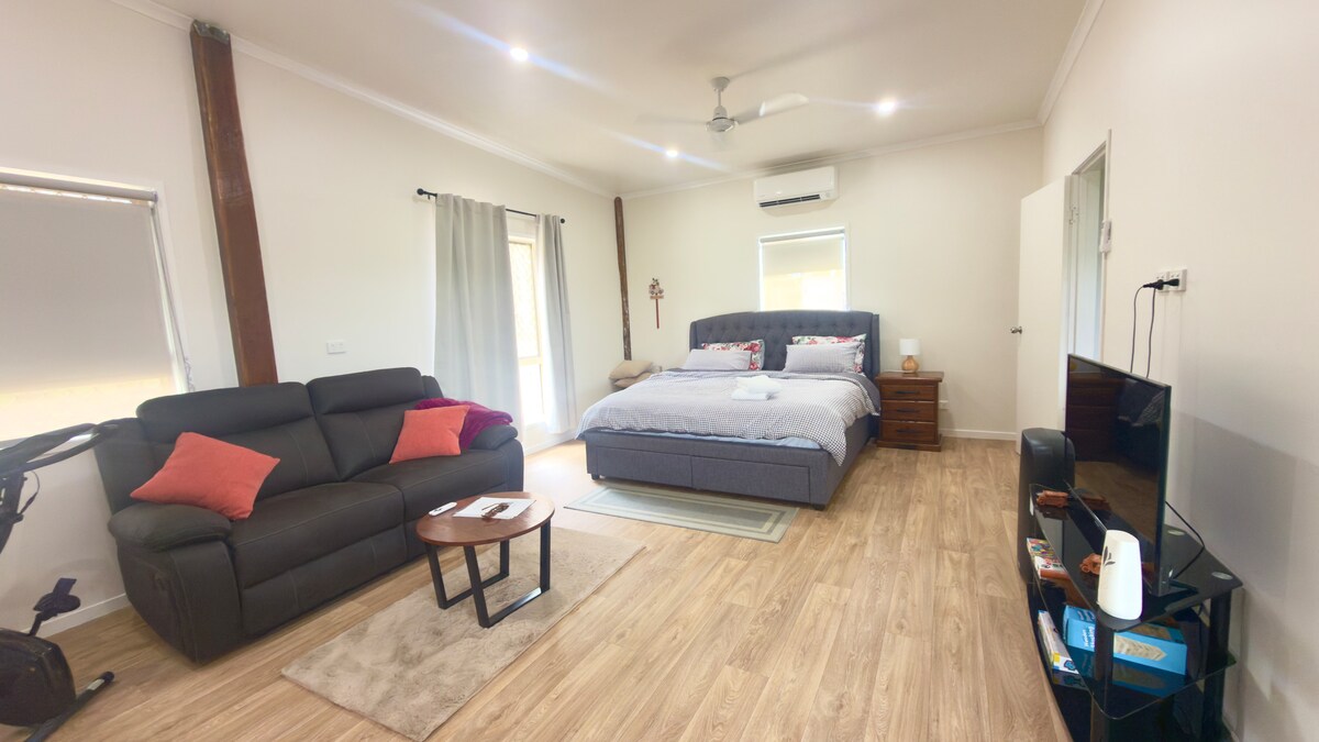 Phòng riêng và rộng rãi có giường queen, bếp nhỏ và ghế sofa với phòng tắm phù hợp cho người có nhu cầu đặc biệt. Bên ngoài sân hiên nhìn ra vùng đất bụi rậm và sông Burnett với chỗ ngồi và bbq. 10 phút đến trung tâm mua sắm và nhà hàng, 15 phút đến Bundaberg CBD. Xin lưu ý không CÓ Wi-Fi, nhưng chúng tôi có lễ tân Telstra và Optus và bạn có thể truy cập TV để phát trực tuyến các dịch vụ. Chúng tôi không cho phép chó tại chỗ, điều này là vì sự an toàn của chính chúng vì chỗ ở của chúng tôi không có hàng rào đầy đủ.