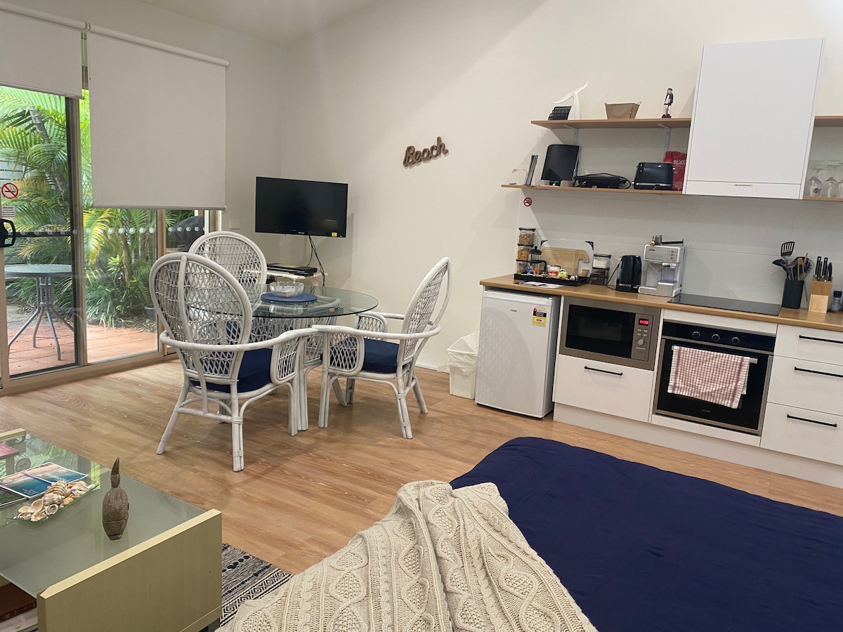 Privately owned Studio Villa set in a holiday resort which is on the beach and encompasses 3 swimming pools,2 tennis courts, playground and outdoor undercover BBQ areas . There is a Thai restaurant hours are 5-8pm eat in or take away. Not open Tuesdays ! NB The Thai is closed until 2nd May ! Please read my listing until the end. YOU MUST have Government ID verification ( ie license) , photo and 1 POSITIVE REVIEW FROM ANOTHER HOST TO be ABLE TO BOOK.