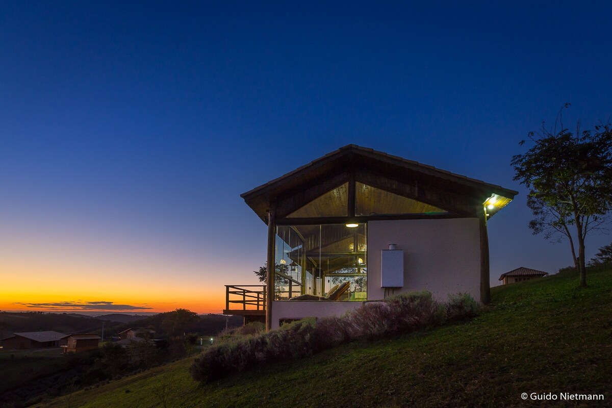 Một nhà gỗ chalet rộng rãi bên trong Contemplar với giường đôi cỡ king, lò sưởi, bồn tắm nước nóng, nhà bếp nhỏ được trang bị và sân thượng, tất cả đều có tầm nhìn toàn cảnh ra các đồn điền hoa oải hương và hoàng hôn. Một không gian ấm cúng, được bao quanh bởi thiên nhiên, lý tưởng cho các cặp đôi muốn ngắt kết nối hoặc dành một cuối tuần lãng mạn ở Cunha.