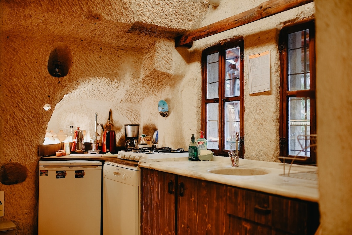 Kapadokyada bahçesi olan 10 kişiye kadar kalınabilen rahat edebileceğiniz mükemmel manzaraya sahip kayadan oyma mağara evdir.