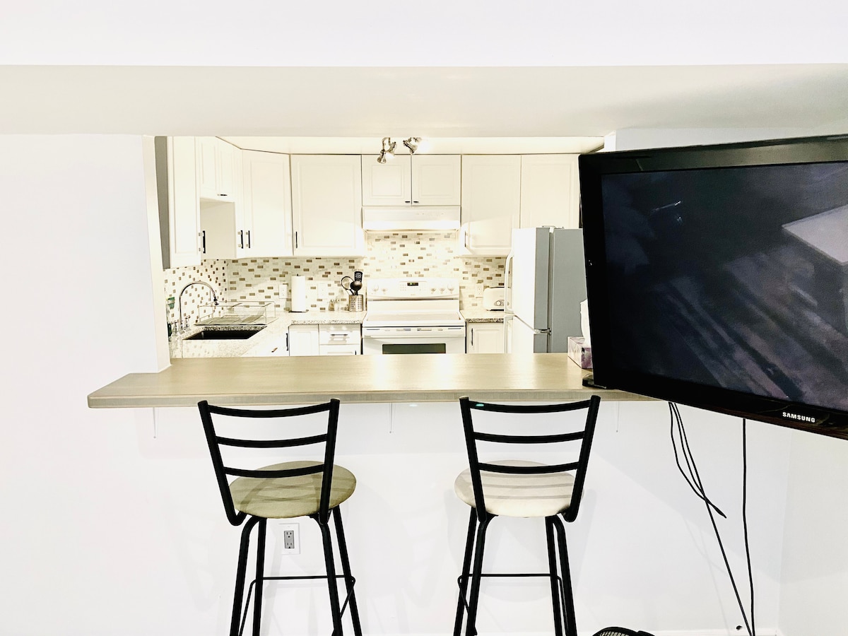 We've recently renovated our basement to create a stylish, modern, cozy and quiet guest suite. There is a side entrance that opens directly onto stairs taking you down to the unit. It has a locking metal exterior door for sound-proofing and security. The unit is a bright studio apartment with three large windows, a full kitchen, sitting area with tv and fireplace, dining table, queen-sized bed, walk-in closet and your own private bathroom with a five-foot shower. With extensive sound-proofing!