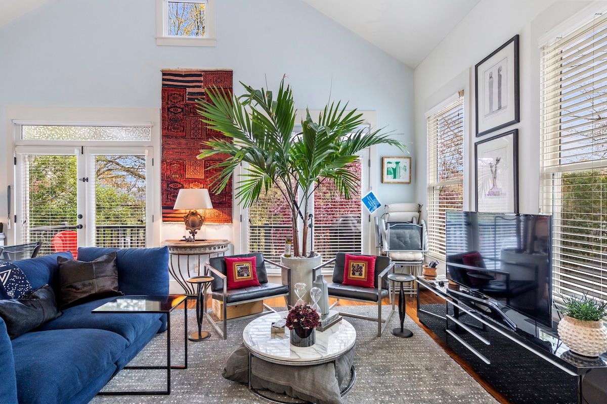Modern recently remodeled carriage house in Atlanta, GA with quick access to the BeltLine. This open space studio features a comfy queen bed, free high speed wifi and a smart TV. There is a dual purpose table/desk with an ergonomic task chair. The kitchen is fully equipped with all the amenities to prepare your culinary feasts. Enjoy sunsets on the outdoor deck + a gas BBQ grill. With lots of light and a private setting this carriage house offers privacy with the feel of being in a tree house