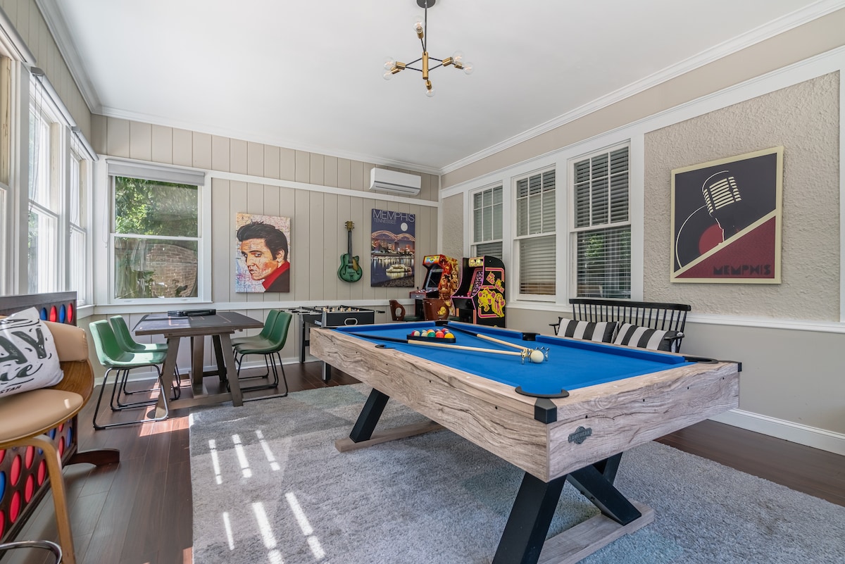 Đá quý ẩn Memphis hiện đại | Phòng trò chơi & Hố lửa