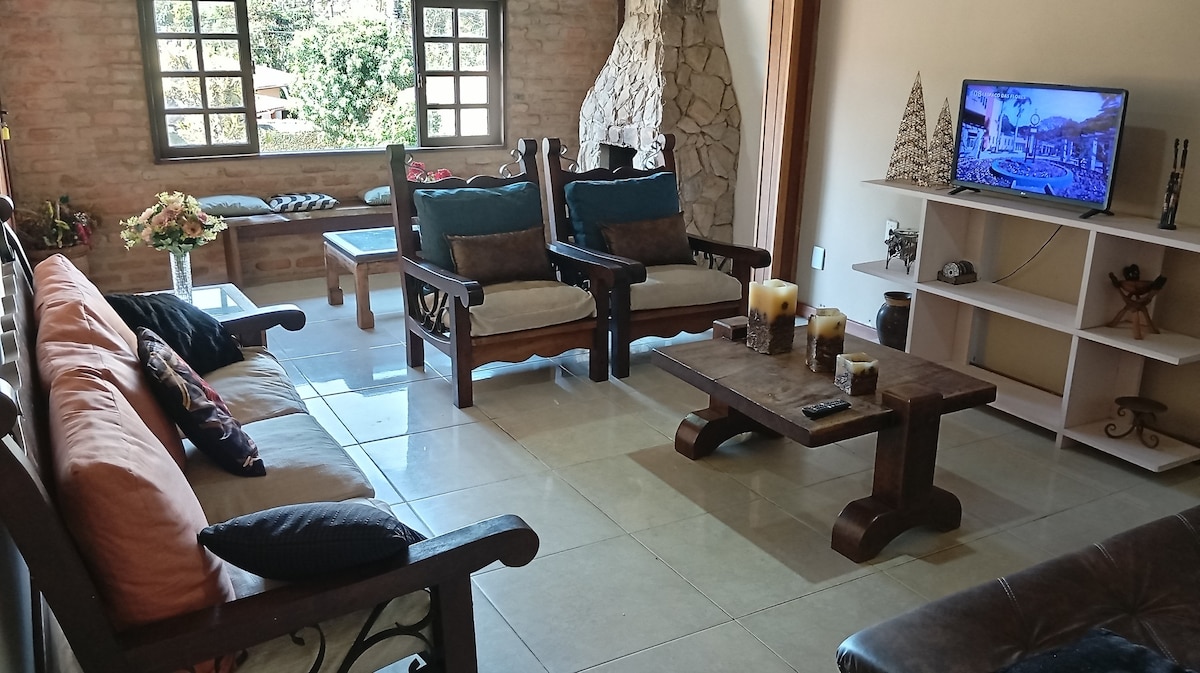 Esqueça de suas preocupações neste lugar espaçoso e tranquilo. Excelente casa com ambiente único e clima agradável Aceito mais pessoas na casa, desde que se organizem por conta própria. 1 quarto e 1 suite com banheiro 1 banheiro social 1 sala com lareira Banheiro: com chuveiro a gás e outro com chuveiro elétrico Cozinha completa (fogão, geladeira, utensílios) Ambiente externo com área verde Vagas para carros Obs: animais de estimação à combinar Acima de 5 hóspedes combinar por mensagem