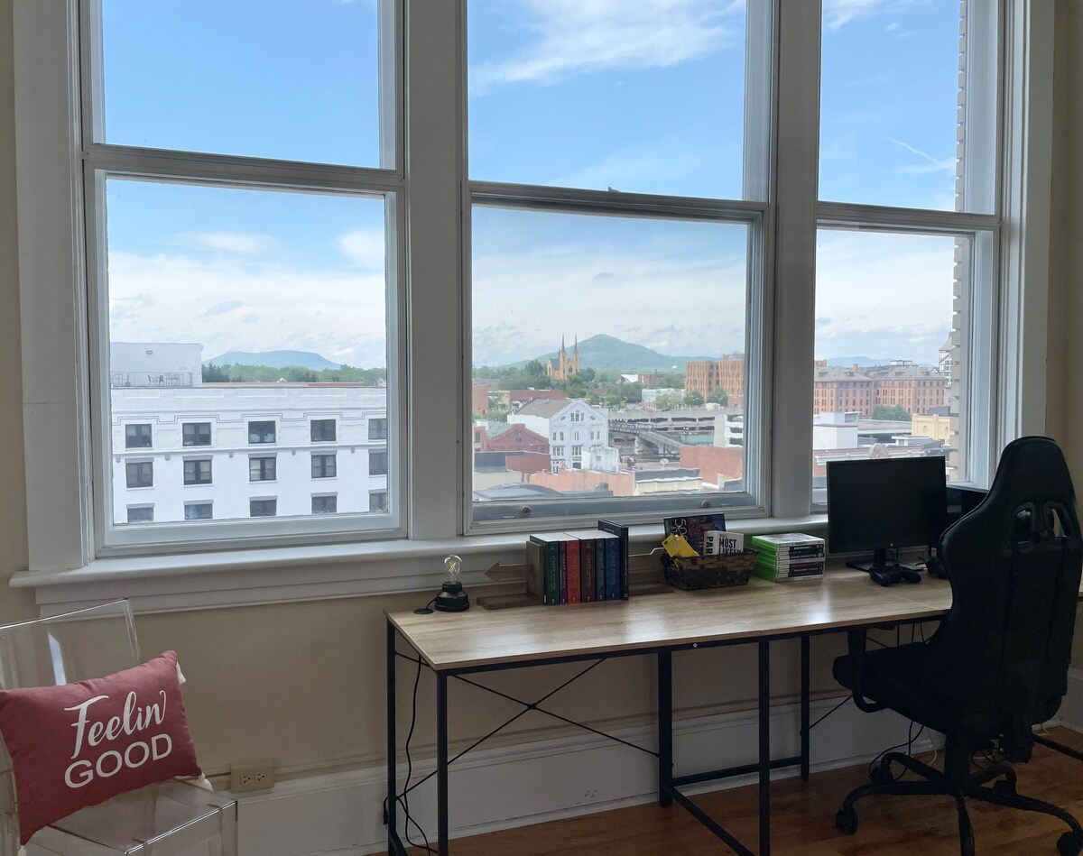Trong thời gian lưu trú tại căn penthouse tại One City Plaza, bạn có thể tận hưởng sự tiện lợi của trung tâm thành phố, sống trong một căn hộ yên tĩnh, an toàn rộng 1.600 feet vuông. Nơi này có sàn gỗ cứng nguyên bản, trần nhà 11 feet và cửa sổ lớn trải dài trên toàn bộ chiều dài của căn hộ mang đến tầm nhìn đẹp như tranh vẽ ra đường chân trời thành phố so với nền của dãy núi Appalachian. Không gian này có hai giường cỡ king, phòng trò chơi và bếp đầy đủ tiện nghi để phù hợp với bất kỳ thời gian lưu trú nào.