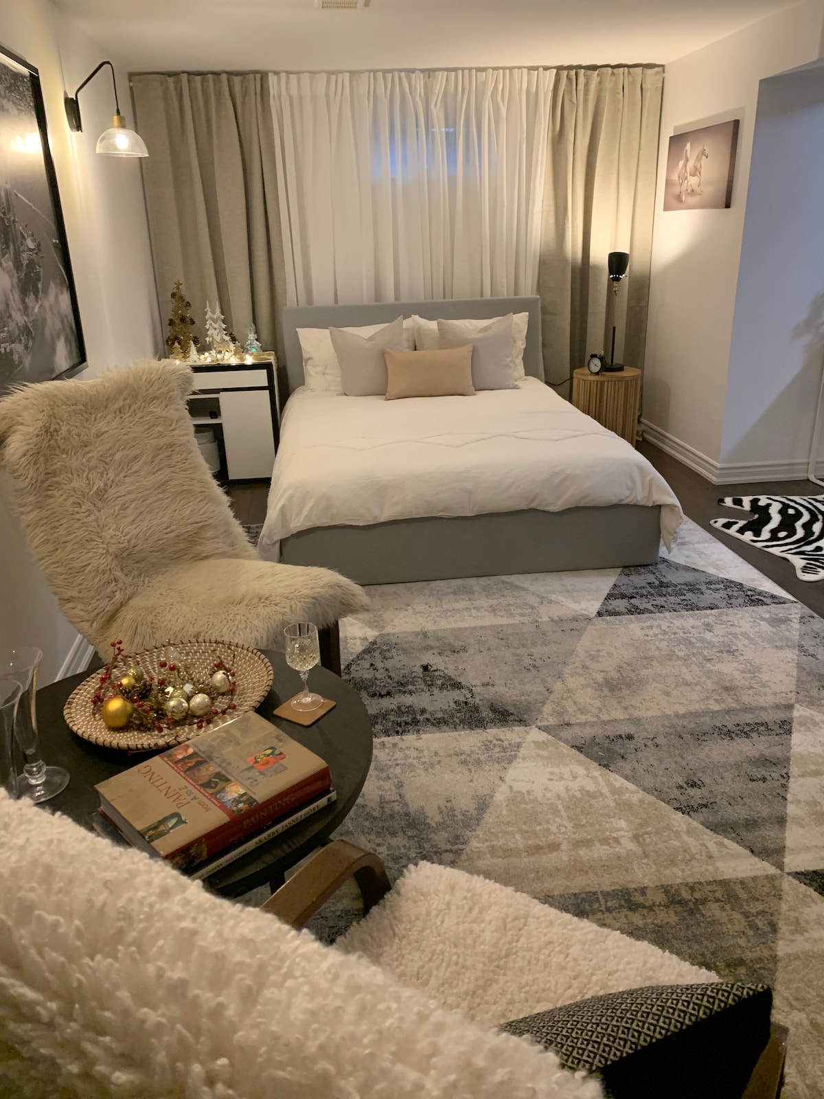 Calm and stylish space in great neighborhood of Mississauga with a queen size bed, fully equipped kitchen, new appliances. Excellent location; Easy access to HWY 403 & QEW. Close to shopping, restaurants and parks. Bus stop minutes away. 5 min. drive to beautiful town of Oakville, 30 min. to Downotow Toronto, 60 min. drive to Niagara Falls