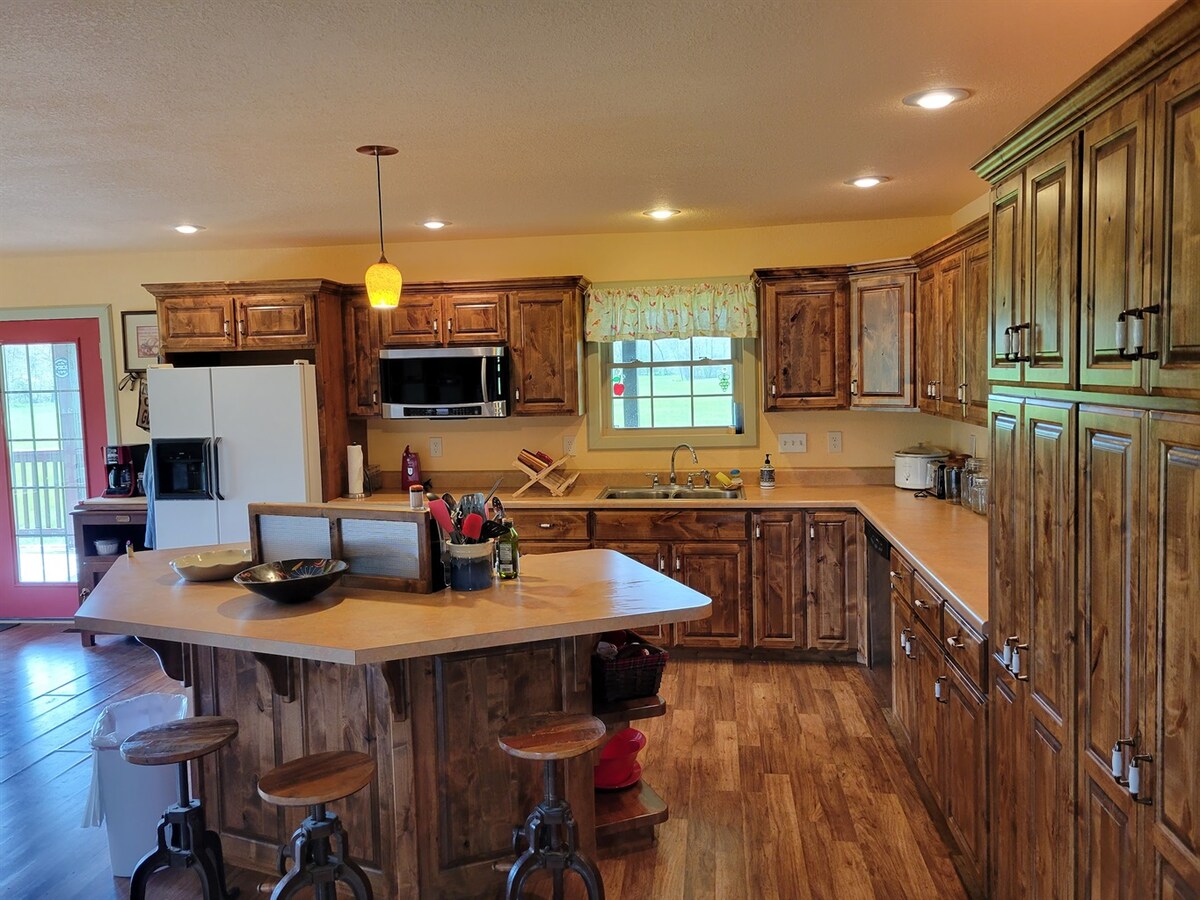 Thư giãn tâm trí, cơ thể và tinh thần của bạn với nơi nghỉ dưỡng sang trọng thanh bình này ẩn mình trong một khung cảnh hẻo lánh tuyệt đẹp giáp với Rừng Quốc gia Mark Twain và trong vòng một giờ từ Hồ Ozarks và Springfield! Đây là nơi nghỉ ngơi hoàn hảo cho các gia đình, bạn bè hoặc cá nhân muốn dành thời gian chất lượng và tận hưởng thiên nhiên! Chỗ ở có hồ bơi nước nóng, bồn tắm nước nóng, ao đầy cá, phòng trò chơi, bàn bi-a, lò sưởi ngoài trời và tầm nhìn từ mọi ngóc ngách!