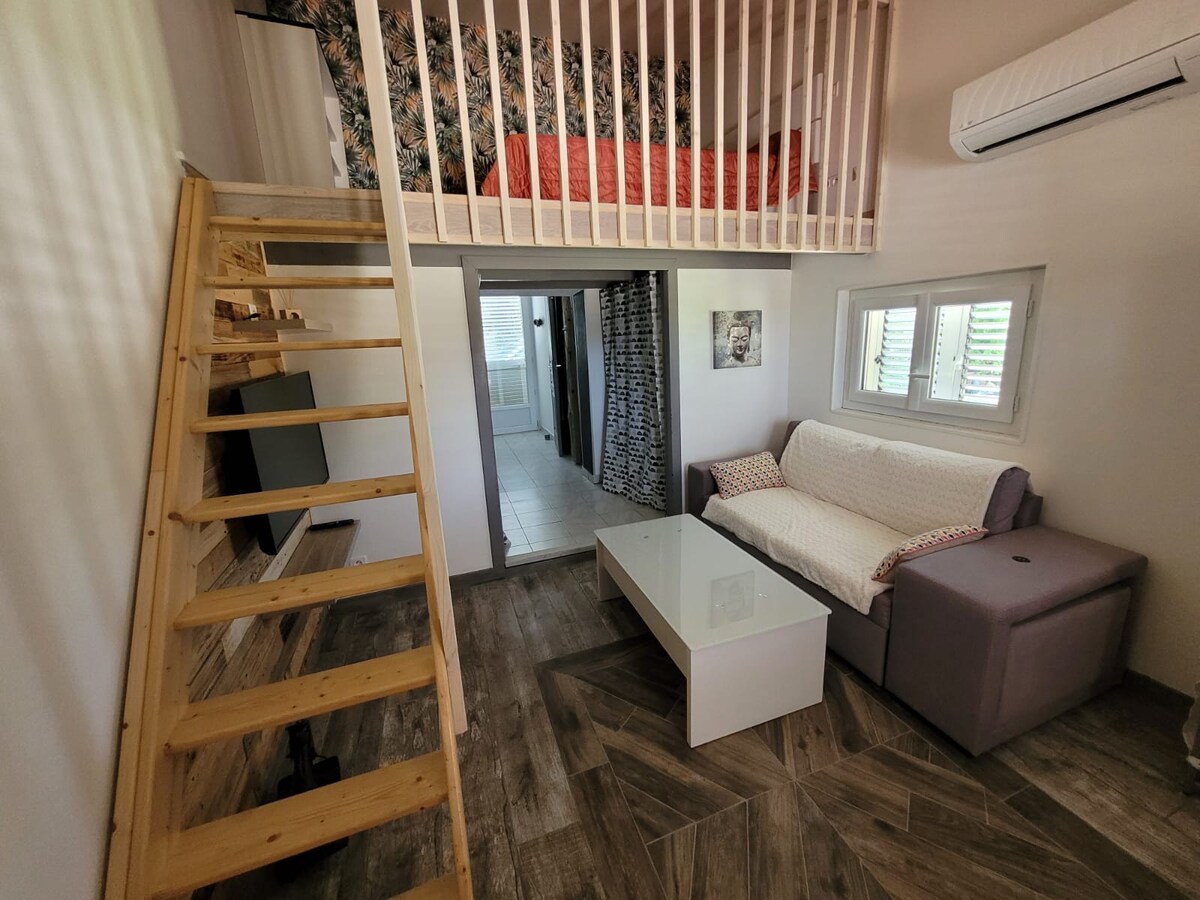 Petit appartement deux pièces cosy, avec cuisine équipée pour accueillir deux personnes dans le confort et le calme Terrasse privative située sur la partie ombragée de la maison, pergola en bois massif Point fort du logement : équipements et literie de qualité Point fort du site: le calme et la fraîcheur des collines a 20 minutes des criques de Lava Accès a la piscine de l'habitation autorisé, il n'y a pas d'autres locations sur le site