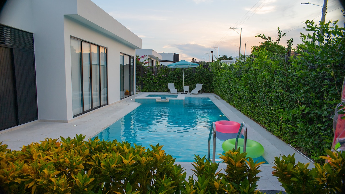 Nhà nghỉ thôn dã hiện đại và rộng rãi chỉ cách Girardot 5 phút. Tận hưởng thời tiết tuyệt vời, đầy nắng trong một ngôi nhà riêng bao gồm: điều hòa không khí và phòng tắm riêng trong mỗi phòng; hồ bơi riêng, bể sục và phòng tắm Thổ Nhĩ Kỳ; nhà bếp với tất cả các thiết bị; khu vực BBQ hoạt động trên gỗ, khí đốt và carbon; bàn ăn bên trong và bên ngoài; máy giặt; khu vực xã hội lý tưởng cho các nhóm lớn, với TV thông minh và điều hòa nhiệt độ; phòng tập thể dục.