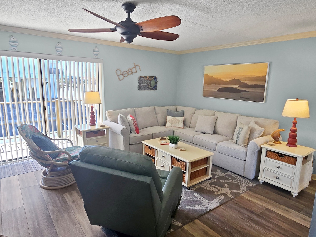 Bước ra bãi biển! Căn hộ chung cư được cải tạo hoàn toàn, sáng sủa, hiện đại, sạch sẽ với tầm nhìn ra ban công đại dương. Vị trí yên tĩnh của thành phố North Ocean với khoảng cách đi bộ đến các nhà hàng, xe buýt, 7-11, sân golf mini, rạp chiếu phim, công viên, v.v. Thiết bị và đồ nội thất hoàn toàn mới. Wifi miễn phí, Giường cỡ King, TV 60" & 40". Kéo ghế sofa Queen ra, phòng tắm đầy đủ hoàn toàn mới. Máy giặt và máy sấy trong căn hộ. Trạm cà phê Keurig, trạm sạc iPhone. Ban công riêng. Chỗ đỗ xe miễn phí.