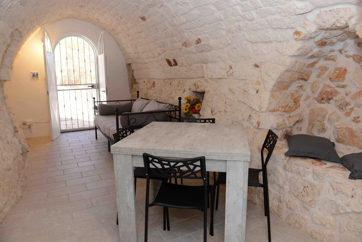 Antico Trullo saraceno del 1400 ristrutturato recentemente. Composto da una parte antica finemente ristrutturata che si collega ad una parte moderna. La struttura è composta da una camera matrimoniale ( con aria condizionata) , un bagno con doccia e lavatrice, una cucina completa di tutto ( con lavastoviglie) che si affaccia su una veranda con gazebo, soggiorno con divano letto, seconda camera da letto con 2 letti singoli eventualmente unibili in matrimoniale. Ogni stanza ha la tv .