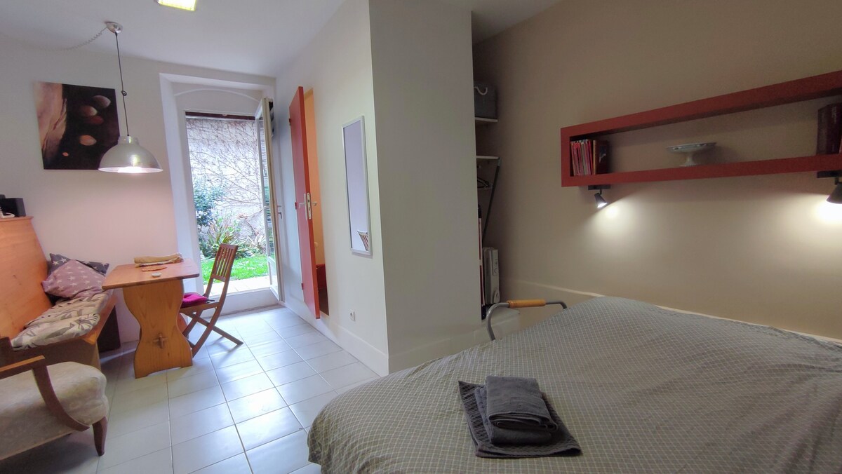 Chỗ ở tôi cung cấp cung cấp tất cả các tiện nghi trong sự đơn giản. Nó bao gồm một căn phòng lớn với giường cho 2 người (140 x 190) phòng tắm khép kín với nhà vệ sinh, bếp nhỏ được trang bị (MO, tủ lạnh, máy pha cà phê, máy nướng bánh mì...). Chỗ ở nhìn ra một sân thượng nhỏ ở tầng trệt đối diện với Pyrenees với bàn và ghế vườn. Chỗ ở nằm ở tầng vườn trong một ngôi nhà riêng gồm ba tầng. Tầng trệt/khu vườn duy nhất dành cho thuê.