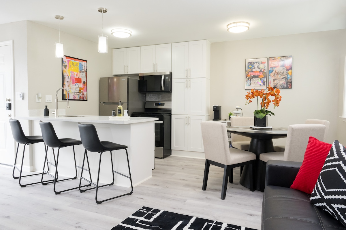 Thiết kế bậc thầy và sự thanh lịch hiện đại được thể hiện độc đáo trong kỳ nghỉ này. Ngôi nhà có bố cục mở, nội thất sang trọng, màu sắc trung tính tươi sáng và tương phản với tính thẩm mỹ hiện đại tổng thể. ✔ Tọa lạc ngay trung tâm Montrose, cách trung tâm thành phố/trung tâm thành phố vài phút ✔ Điểm đi bộ 91 - Bạn có thể đi bộ đến mọi nơi! ✔ Phòng ngủ cho 5 khách trở lên trên 2 giường king và ghế sofa phân đoạn TV thông minh ✔ 75"với Netflix, Hulu, Disney+, ESPN MIỄN PHÍ Internet Wi-Fi tốc độ ✔ cao 1Gbps Chỗ đỗ xe được đặt trước ✔ miễn phí trong bãi đỗ xe riêng