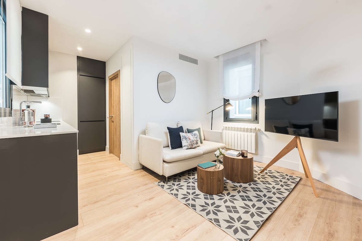 Magnificent 45 square meter apartment in the heart of Madrid. With spectacular design and decoration, spacious areas, and high ceilings, the apartment is equipped with everything you need for your stay in Madrid. The living room has three balconies overlooking the street that provide great brightness to the flat. The bedroom has an en-suite bathroom and a work desk. From the apartment, you can walk to almost all the iconic points of Madrid.
