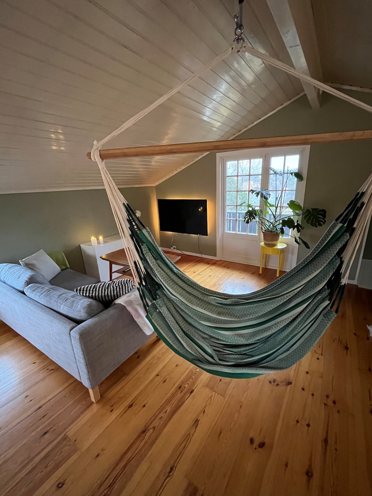 Căn gác gara ấm cúng với bếp nhỏ và phòng tắm với vòi sen và nhà vệ sinh. Phòng khách VÀ phòng ngủ trong cùng một phòng. Khu vực ăn uống, bếp nhỏ, tủ lạnh và máy pha cà phê. Sử dụng phòng giặt có máy giặt và máy sấy, bàn là và cầu là. Nhìn từ hiên/lối vào. Lối vào riêng và bãi đỗ xe miễn phí trước gara. Giường giày cho trẻ nhỏ có thể được sử dụng.