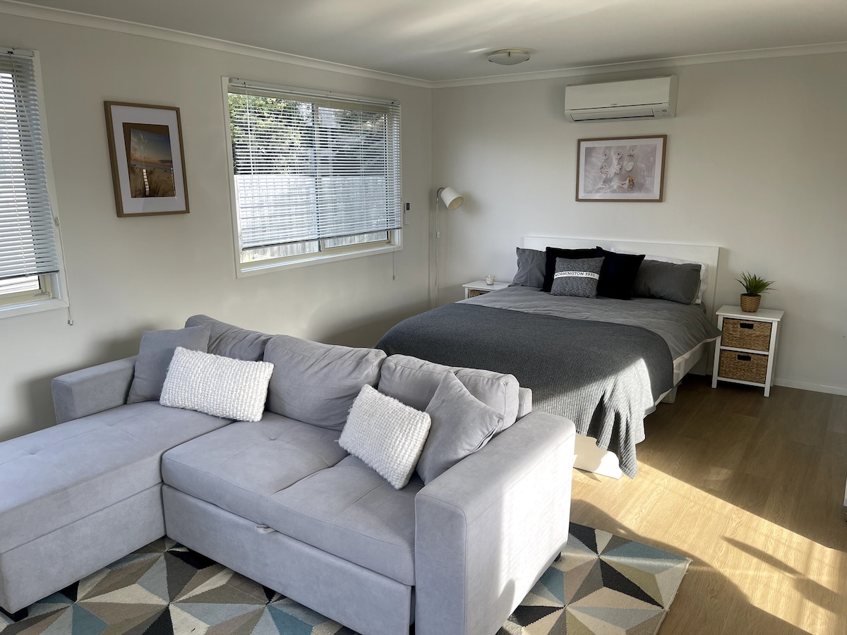 Quiet, luxurious guest house. A perfect couples retreat within walking distance of Fisherman’s Beach and Mornington Main Street (approx. 15 min). Accommodation comprises open plan lounge, kitchen, dining area, double bedroom and shower room with laundry facilities. Patio doors lead to a private decking where you can bath in the sun or shelter beneath the retractable awning. Split system heating and cooling.