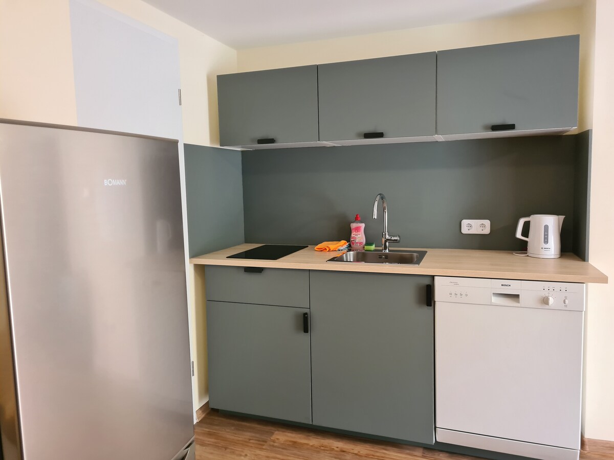 Màu sắc vui tươi và tông màu gỗ ấm áp thấm vào căn hộ thoáng đãng và tươi sáng này. Khi bạn thức dậy vào buổi sáng, những tia nắng đầu tiên chiếu qua các cửa sổ lớn và chào đón một ngày. Và khi thời tiết ảm đạm, chỉ cần tự nhiên thoải mái trên ghế sofa bên cạnh bếp củi. Khu vực ngủ có giường đôi và giường tầng có thể được ngăn cách bằng cửa trượt lớn, cũ. Có thể ăn sáng từ thứ Ba đến Chủ nhật trong quán cà phê/quán rượu của chúng tôi. Phòng xông hơi khô, thuê Ebike