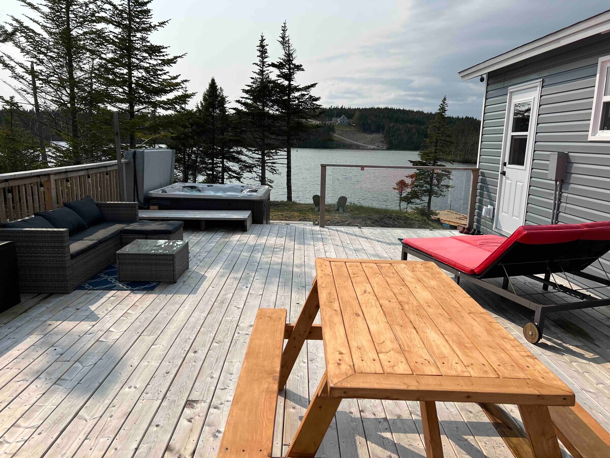Note that no additional cleaning fees added and. 10 percent off for 5 nights or more Relax under the covered craftsman porch of this new custom designed beauty. The house checks all the boxes-ultimate privacy, large deck w/hot tub, vaulted ceilings with beams and a reading nook. Located in South River by Cupids/Brigus & a short walk from the ocean and a 7 min walk to the Nl Distillery. We are 45 mins west of St. John’s. The simple elegance of this house is refreshing for the soul