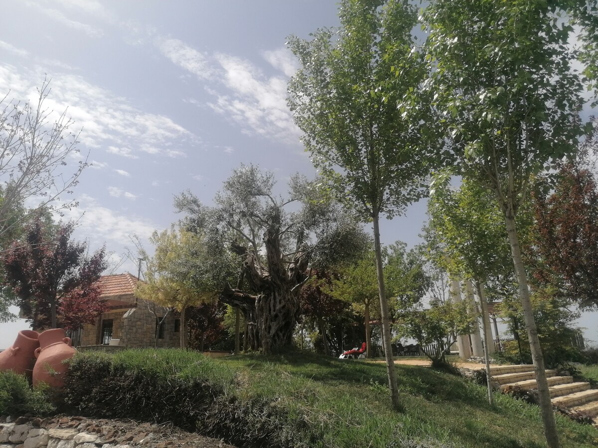 Đây là khu vực mở rộng lớn cho các sự kiện hoặc tụ tập. Đó là một không gian mở rộng lớn với một ngôi nhà trên cây và tầm nhìn nổi bật ra làng Ain Dara và Barouk Cedars. Có một hồ bơi nhỏ bên cạnh và cũng có một khu vực BBQ. Bổ sung mới nhất của chúng tôi là một Caravan mà bạn có thể thuê nếu bạn muốn ở trong khu vực ngoài trời. Nó phù hợp với 5 người đang ngủ, bạn có thể thuê nó với một khoản phụ phí. Khách có thể thư giãn ở đây vào ban ngày hoặc ban đêm, và tận hưởng khung cảnh đẹp và đồ ăn ngon từ Ain Dara.