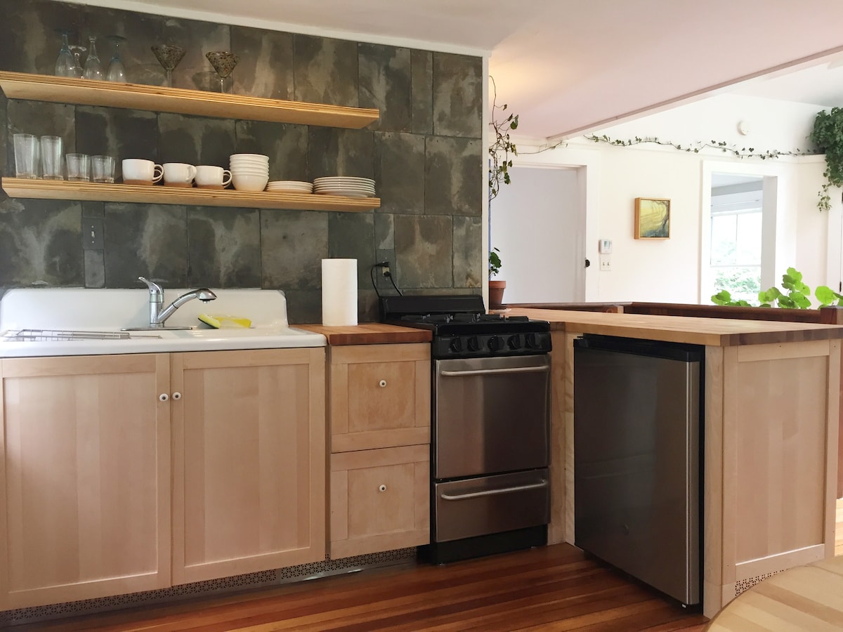 Sunny and open writing studio with over 150 years of literary history. Built in 1870, this lovely little house was where George Curtis edited Harper's magazine, wrote essays on transcendentalism , and argued for women's suffrage ( A recent guest informs me that George Curtis helped Thoreau build his cabin on Walden Pond ) The house has since sheltered painters, librarians, and poets.