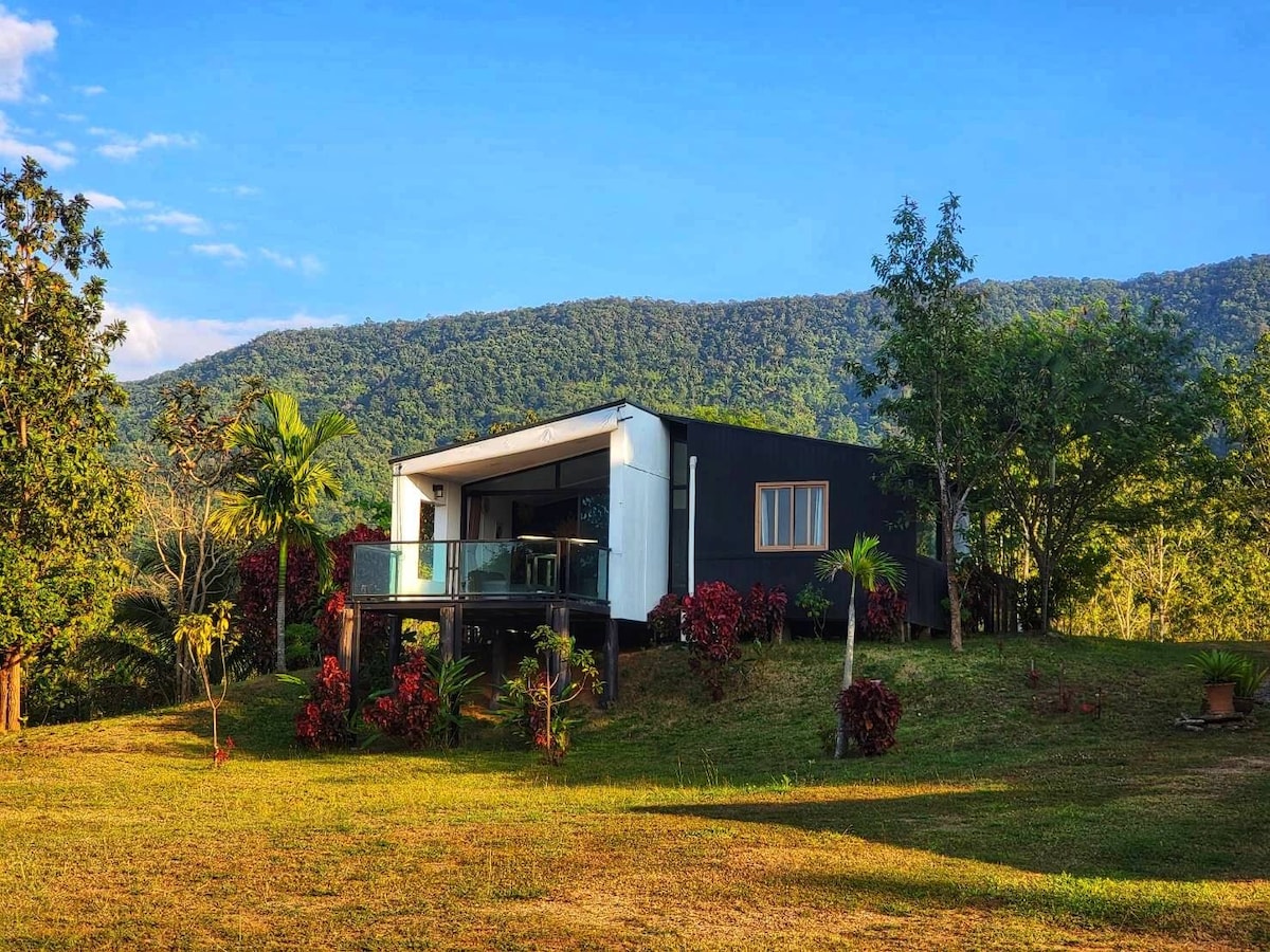 Thư giãn cùng cả gia đình tại chỗ ở yên bình này. Một ngôi nhà hai tầng cho 5 người ở giữa rừng trên ngọn núi riêng của chúng tôi, cách ngôi đền trắng và công viên singha 10 phút và chỉ cách thác nước cao nhất ở Chiang Rai 5 km, nơi bạn có thể đi bộ và bơi lội. Phòng có ban công 60 m2 và hố lửa phía sau nhà
