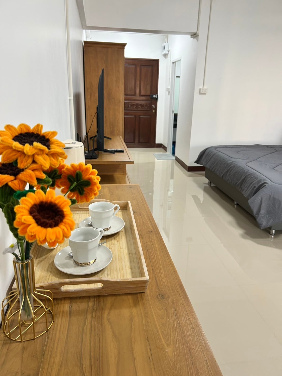 Phòng là phòng một phòng ngủ với khu vực sinh hoạt, chẳng hạn như tủ lạnh, điều hòa không khí, TV, lò vi sóng, nồi cơm điện, giường sofa, TV, giường sofa để xem TV, máy nước nóng, bồn rửa, bàn là hơi nước, máy hút bụi, máy sấy tóc, nồi hơi suki và máy xay sinh tố, quầy lưu trữ có kệ, kho chứa giày, giá để đồ, hộp dễ cháy, rèm cửa có vách ngăn bằng kính, bộ bát đĩa, dao và ga trải giường, ga trải giường, gối, chăn. WIFI: sorawis Mật khẩu: 12345678