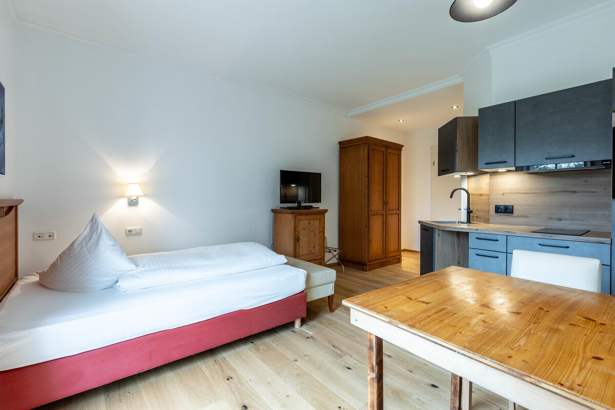 The 24 m² single room on the 1st floor offers everything you need for a relaxing stay. A practical kitchenette and a cozy seating area ensure comfort and flexibility. The wooden floor gives the room a warm atmosphere, and from the balcony you can enjoy a wonderful view of the garden. The modern bathroom is equipped with a shower and WC - ideal for your time out.